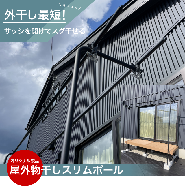 勝手口や玄関から外に出なくても濡れ縁、ウッドデッキからスグに干せるよう