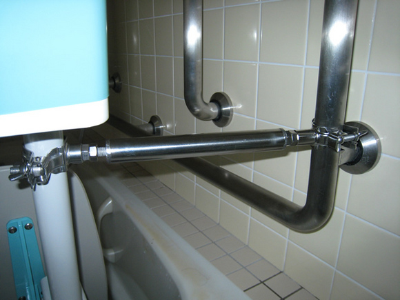 清掃の時、取り外しができるように浴室のステンレス手摺から支持金物を持出し、昇降リフトの横ゆれを軽減させるように設置してあります。..